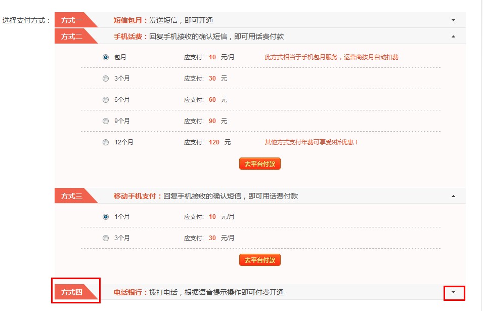 2、进入页面后选择方式四,电话银行支付方式,并点击文字提示后面的“三角”标识;