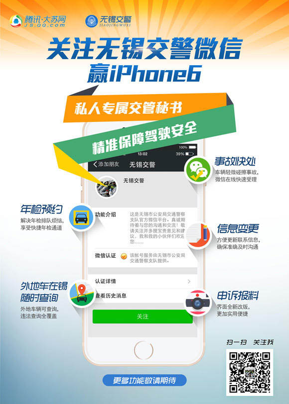 “无锡交警”微信服务号(微信ID:jiaojingwuxi) 终于成功二次升级,各种新功能新服务强烈来袭!新老用户都可以第一时间体验再次升级的“无锡交警”微信。