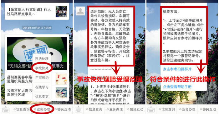 常在路上开,难免有碰擦。车越来越多,就感觉路越来越窄,新手越来越多,“杀手”也越来越多,无论新手老手还是“杀手”,开车在路上最怕的就是各种磕磕碰碰。磕了碰了咋办?不用再打110报警然后等交警到现场了?“无锡交警”微信新增“事故快处”功能,符合条件的碰擦事故,驾驶人只需按要求上传至少四张照片,就能获得一个报警记录号,然后然后快速撤离现场,确认各方联系方式后,共同前往就近的快速理赔服务点(可以通过查询附近理赔点后进行选择),当然,此次记录你可以通过“个人中心——我的快处”中进行查看。