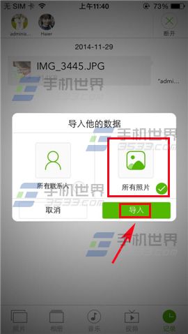 3)选择导入什么数据(例:所有照片),点击【导入】即可将朋友的照片导入自己相册。(如下图)
