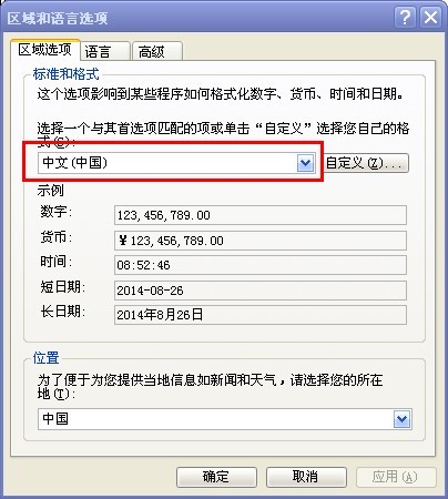 4、在区域和语言选项界面,将格式设置为“中文(中国)”,如下图: