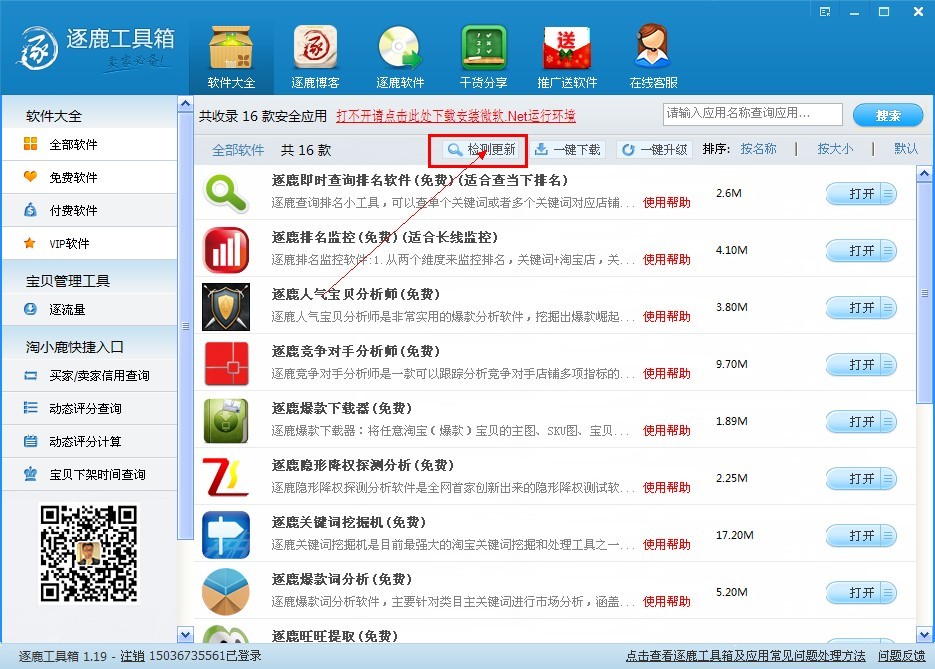 5.设置完成后,重新登录工具箱,文字就可以正常显示。如果,仍然显示为乱码,点解工具箱界面上方的检测更新按钮。如下图: