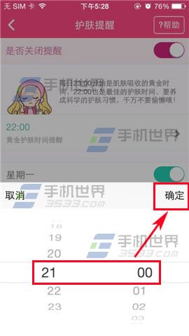 3)在界面选择开启护肤的提醒时间,点击【确定】,返回界面即可看到已开启护肤提醒。(如下图)