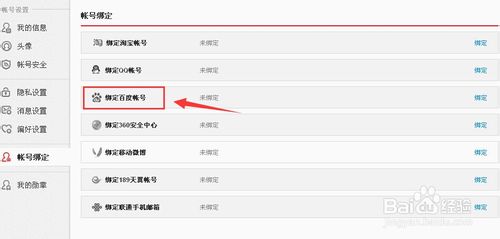 在账号绑定列表中,找到“绑定百度账号”菜单并点击进入设置。(如下图)