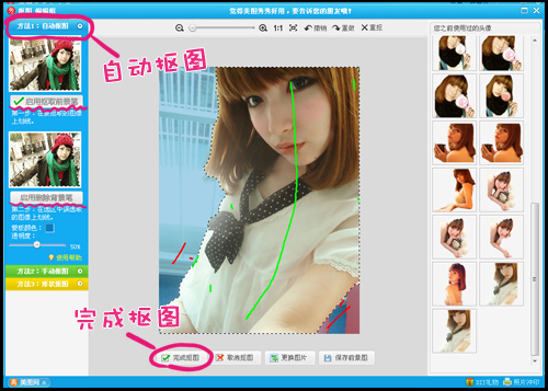 2、在抠图编辑框中选择方法一“自动抠图”,首先点击“启用抠取前景笔”以绿色的画笔在你想要抠取的前景上划线,抠取完毕后,再点击“启用删除背景笔”以红色的画笔在选区中将你误选取的区域是划线,直到前景选区是你满意的效果为止。