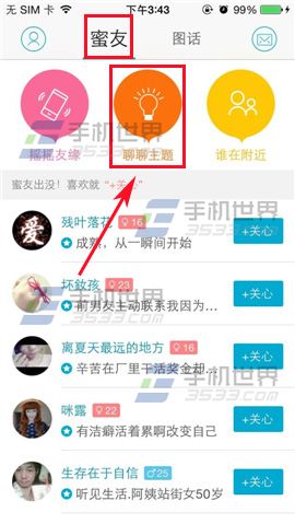 1)首先点击【蜜友圈】,在界面点击【蜜友】,然后点击【聊聊主题】。(如下图)