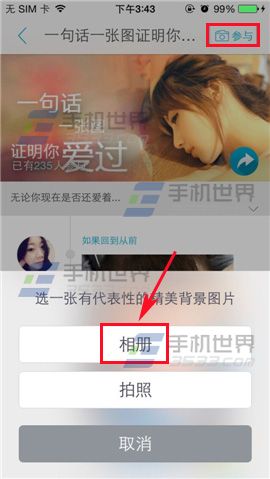 2)在界面选择一个主题进入,在右上方点击【参与】,弹出窗口点击【相册】。(如下图)