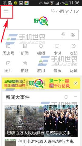 1)首先点击打开【好搜】,在首页左上方点击【三横】。(如下图)