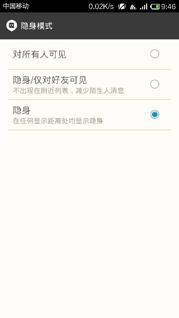 陌陌隐身分为两种,一种是在任何显示距离处均显示隐身,另一种则是不出现在附近列表,减少陌生人消息,也就是距离进队好友可见