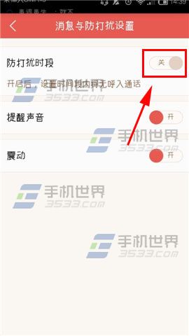 3)打开防打扰时段的【开关】,选择时间段后点击【确定】即可。(如下图)