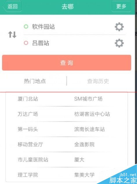 7、输入所在地和目的地:软件园-吕厝,点击查询。