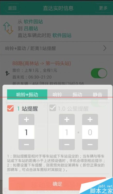 9、距离一站提醒可以设置震动+响铃或者任选其一,选好之后点击确定。