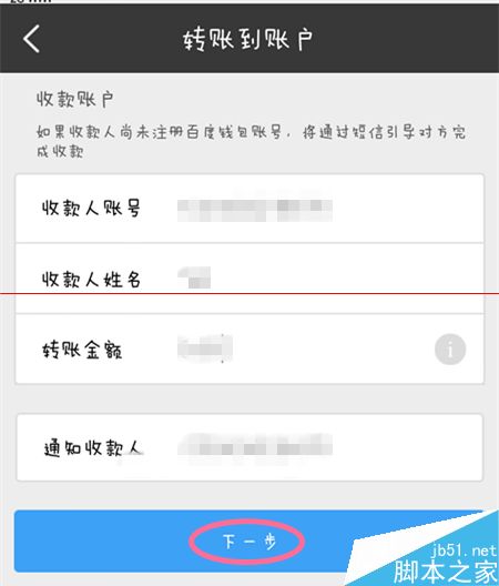 3、转账是指从你的钱包账户转账到他人的百度钱包账户,这种方法你只要输入对方手机号就可以。输入手机号后,点击“下一步”。