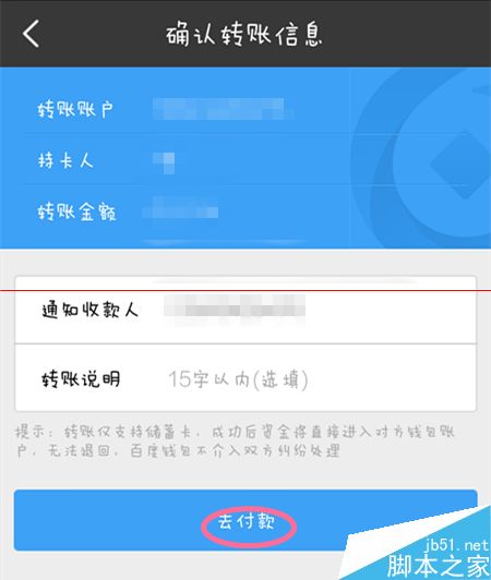 4、输入转账金额,此时会告诉你手机号对应的收款人信息,确认信息后,点击“下一步”后,继续点击“去付款”,输入你的支付宝支付密码。付款完成即会转账到手机号等对应对方的百度钱包中。