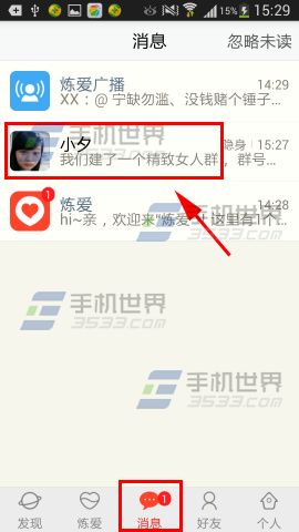 1)打开安装好的炼爱,点击【消息】,找到并点击广告消息。(如下图)