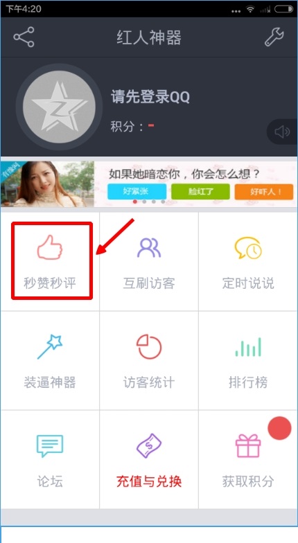 1、秒赞秒评。如图所示,登录你的QQ账号后,进入软件首页,点击“秒赞秒评”,即可开始开始点赞。