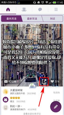 1)打开【耳语】,进入到首页后,选择一张图片,点击图片下方的【分享】按钮。(如下图)