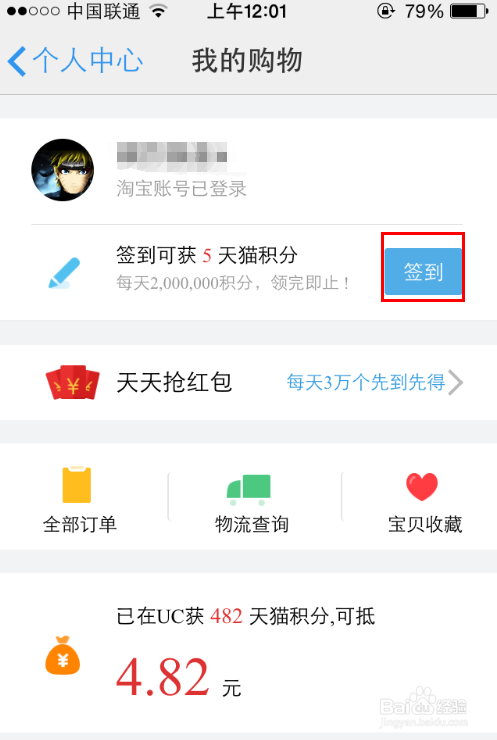 5、我们可以看到签到可以领取5天猫积分,我们点击签到。