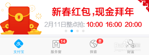 1、由于支付宝、微信与 QQ 发放红包的时间段都是不一样,所以大家还需要密切关注它们发放的时间。以支付宝为例,大家可以在支付宝的主页面,进入“新春红包”查看详细的红包发放时间段。