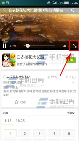 1)打开手机爱奇艺,进入首页后,点击一部【视频】进入到详情页面,点击播放屏幕右下角的【放大全屏】的按钮。(如下图)