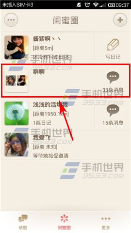 1)打开薇蜜,进入首页后点击进入【闺蜜圈】页面,接着点击一个【群聊讨论组】。(如下图)