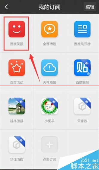 3、可以看到在我的订阅中,默认都是会有一个“百度笑报”图标的,点击: