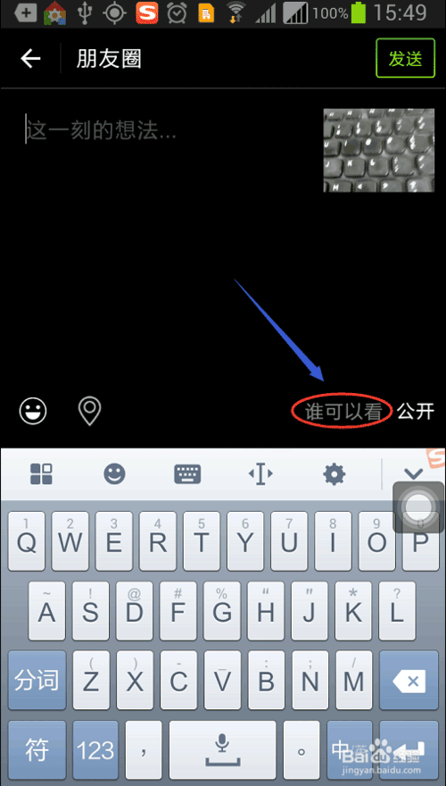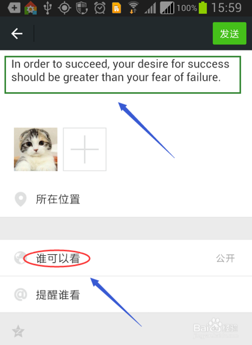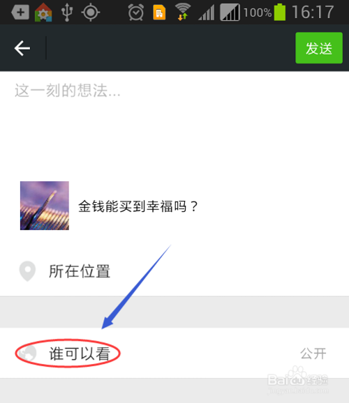 如果我们单纯的发布文字内容是不能做查看权限设置的,见下图;为了设置成只能自己查看,我们唯一的办法就是发布图片内容,然后附带这段文字内容,这样就可以设置权限了