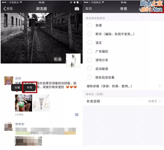 1.如果是个人消息,用户长按内容,在弹出的窗口中点击举报(投诉),选择相应原因提交即可。