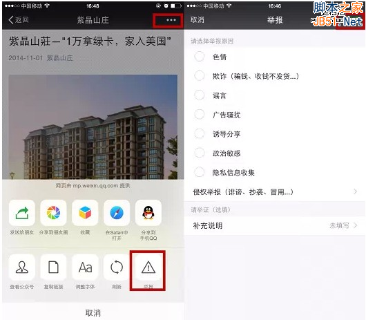 2.如果是公众号消息,点击正文右上角的三个点,在选项列表中选择举报(投诉),再选择举报原因,提交即可。