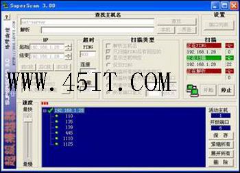 扫描本地系统的端口开放情况,最好在远端机器中进行。下面笔者要扫描IP地址为“192.168.1.28”的机器的端口开放情况,在远端机器中运行SuperScan3.0(见图),在“IP起始”栏中输入“192.168.1.28”,在“结束”栏中也输入“192.168.1.28”,这表示扫描的目标就是IP地址为“192.168.1.28”的机器。