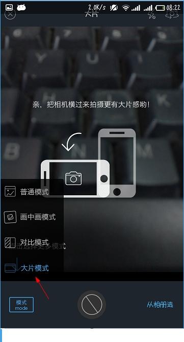 2、注册登录后进入足记主界面,并点击中间蓝色的圈圈并选择照相,在出现的界面中选择“大片模式”,并进行横屏,注意只有横屏才能进行拍照哦。
