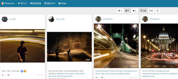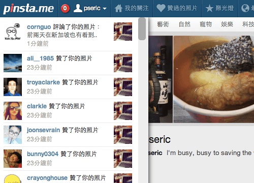 Pinsta.me 的介面设计相当不错,从左上角的通知数字可以知道有谁赞了你的相片,或是在相片上加上评论。
