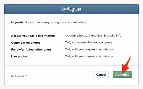 登入时记得要点选「Authorize」来允许 Pinsta.me 存取你的 Instagram 相片和其他资讯。