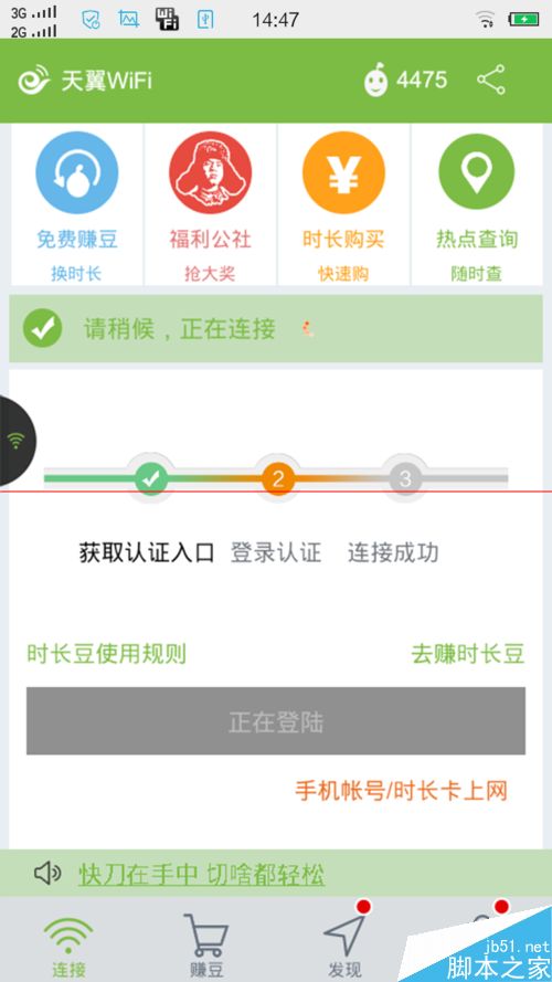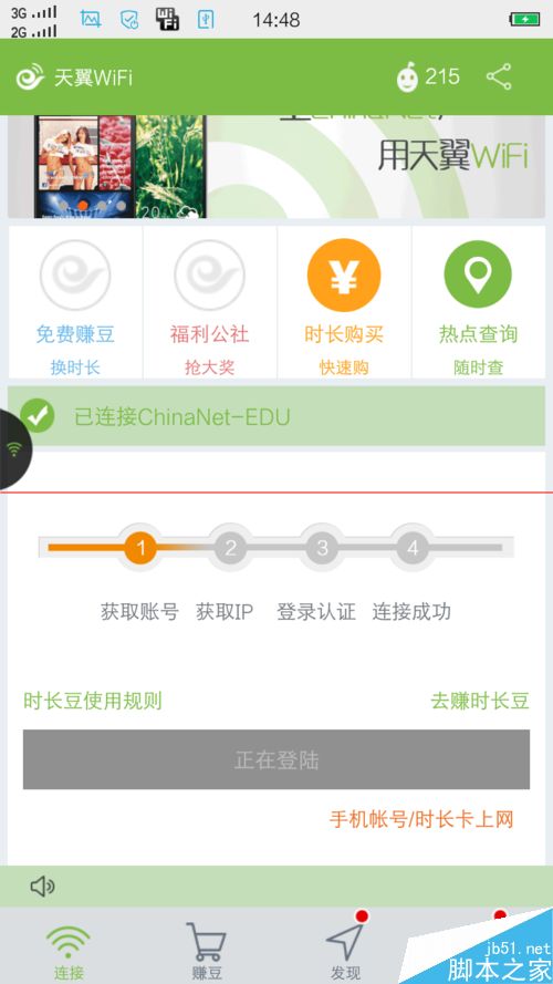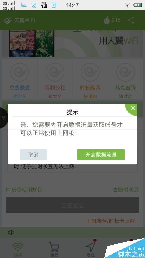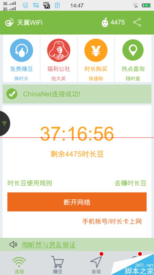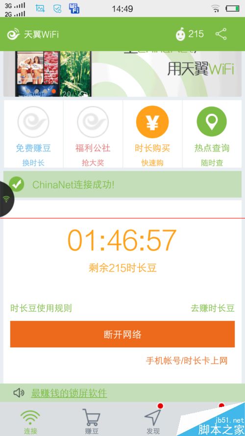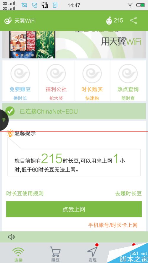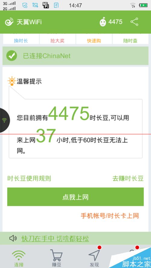 2、返回到天翼WiFi客户端,查看您的时长豆和上网时间,60个时长豆以上才可上网