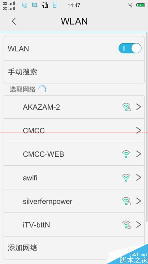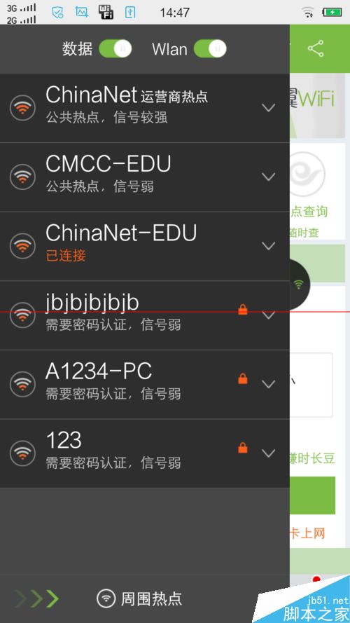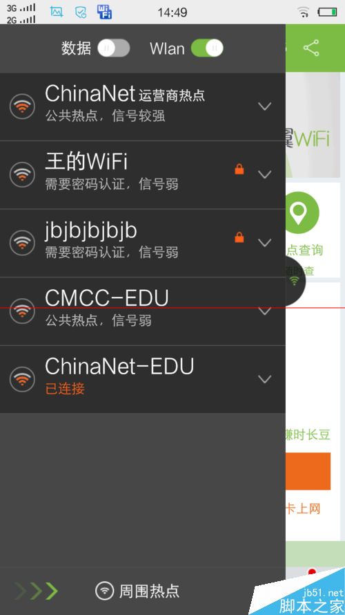 6、点击右侧半圆形黑色按钮,查找周边ChinaNet-EDU热点,点击您要连的ChinaNet-EDU热点(您也可在一开始就同时打开WLAN开关和移动数据流量开关)