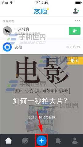 1)打开友拍,进入首页后点击下方的【+】号键,在弹出的三个选项中点击左右边的【电影模式】。(如下图)
