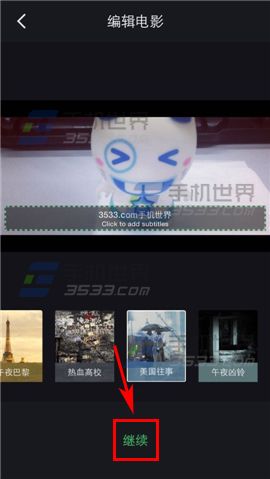 3)拍照或者选择照片后进入到图片裁剪,上下移动选取裁剪范围,然后跳转至编辑电影页面,添加字幕和滤镜,接着点击【继续】,给图片输入描述文字后点击【发布】即可。(如下图)