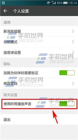 2)选择【设置】,打开【使用听筒播放声音】选项,这样语音的默认播放方式就不是外放了。(如下图)