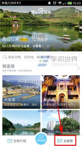 1)打开【百度旅游】,进入首页后点击【发画册】的按钮。(如下图)