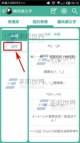 1)打开喵呜颜文字,进入首页后点击【我的表情】专区,接着点击【DIY】一栏。(如下图)