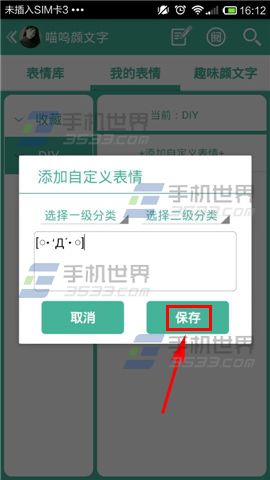 2)选择【添加自定义表情】,在框框里输入颜文字,选择好分类即可【保存】。(如下图)