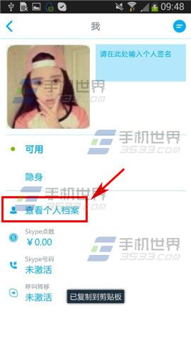 1)首先打开skype软件进入主页,然后点击右上角【红色小边框】,进入后在点击【查看个人资料】;(如下图)