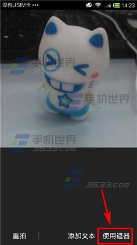 2)跳转到拍摄模式,你可以现场取景,则按【黄色圆圈】进行拍摄,也可以点击左下角的【照片】按钮进入到本地选择照片;拍摄或选择好照片后呢,点击【使用遮器】。(如下图)