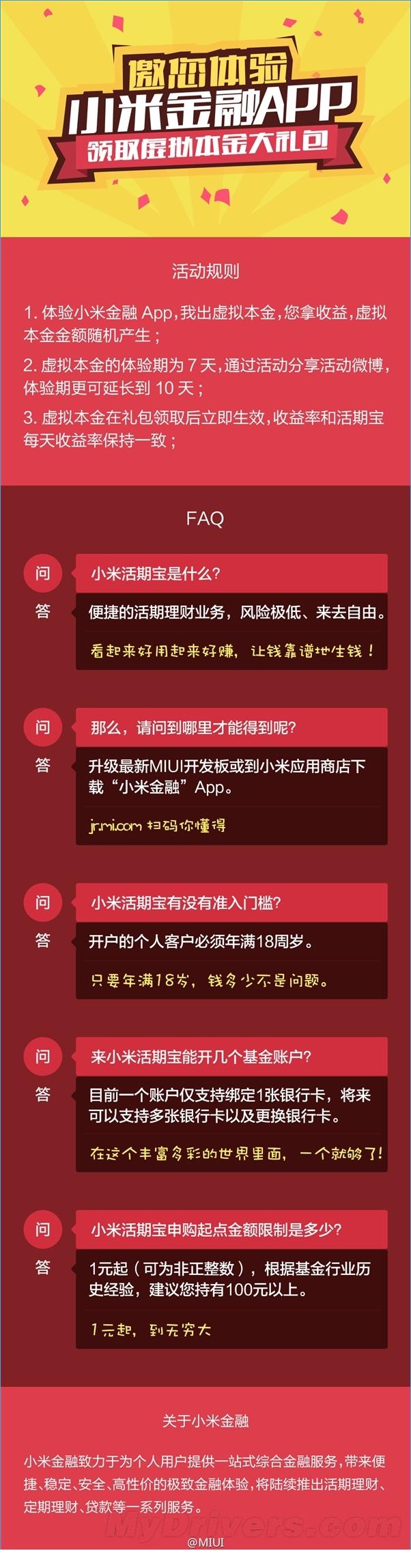 - 5月11日消息,小米金融今天正式上线旗下互联网金融产品“小米活期宝”,易方达的天天理财基金也成为了首个与小米金融合作的产品。那么小米金融活期宝是什么?小米活期宝怎么样2015-05-12