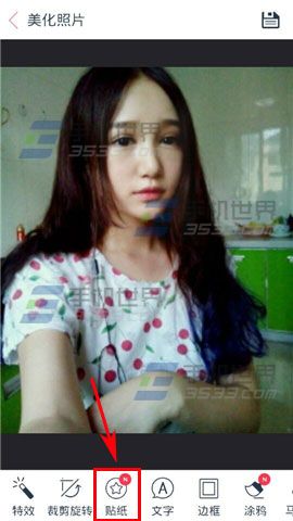 1)打开天天P图进入首页后点击【美化照片】,跳转到相册中,从相册中选取一张照片,接着点击【贴纸】按钮。(如下图)