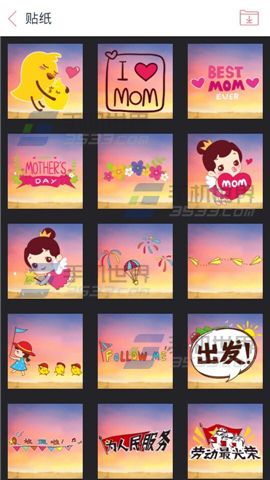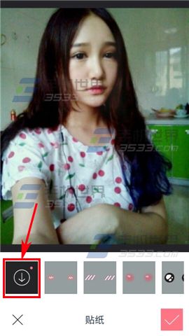 2)进入到到贴纸页面后,点击【↓】的按钮,可进入到贴纸商城,这里有更多萌萌哒贴纸等着你哦。(如下图)