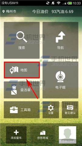 1)打开悠悠驾车,进入首页后点击【地图】按钮,定位到当前位置后,点击【附近】按钮。(如下图)