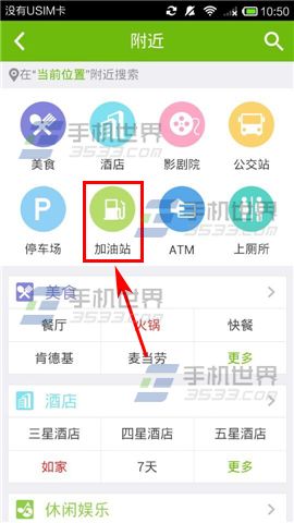 2)跳转到附近设施页面后,小编点击【加油站】示范给你大家看看,可以看到系统会快速给你搜索出附近的加油站地点,点击最近的一个加油站就会为你导航啦。(如下图)