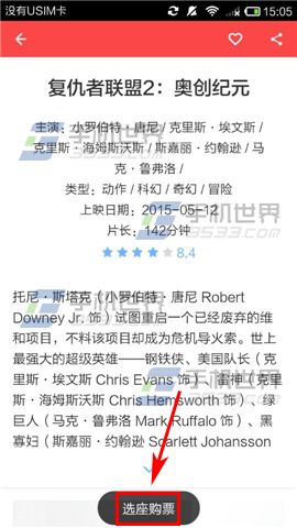 2)选择一部想要看到【电影】,点击进去,接着点击【选座购票】按钮。(如下图)