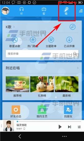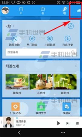 1)打开酷狗,点击右上角【唱】按钮,再点击【...】。(如下图)